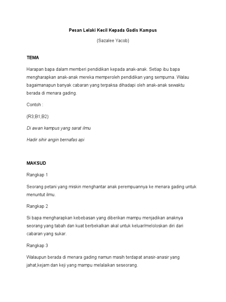 Sajak Pesan Lelaki Kecil kepada Gadis Kampus bertemakan nasihat ibu bapa kepada anak-anak gadis yang menyambung pelajaran di institiusi pengajian tinggi. Nada Unit 6. Anda ingat ketika anda mula-mula mendapat haid atau ketika payudara anda mula masuk anda seperti Ini.