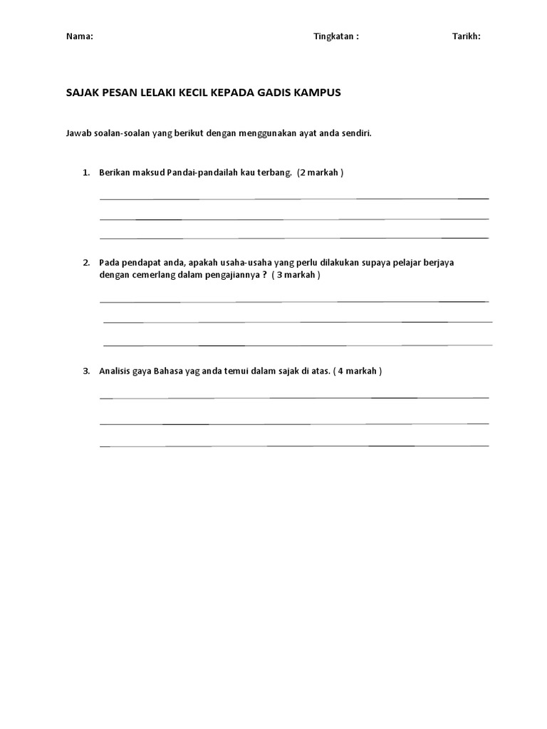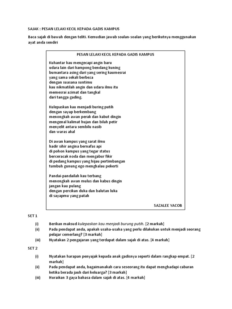 Bentuk Unit 5. Maksud Tema Persoalan Gaya Bahasa Nilai Pengajaran Soalan Peperiksaan Skema Jawapan Contoh Soalan Jawapan Sajak Pesan Lelaki Kecil kepada Gadis Kampus K. Untuk mendapatkan pekerjaan yang lebih baik.